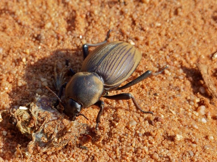 Micro-sized grooves or bumps on the beetle’s hardened forewings can help condense and direct water toward the beetle’s awaiting mouth, while a combination of hydrophilic (water attracting) and hydrophobic (water repelling) areas on these structures may increase fog- and dew-harvesting efficiency. For certain species of darkling beetle, the act of facing into the foggy wind and raising its rear end up in the air (known as fog-basking behavior) is thought to be just as important as body surface structure for successfully harvesting water from the air.