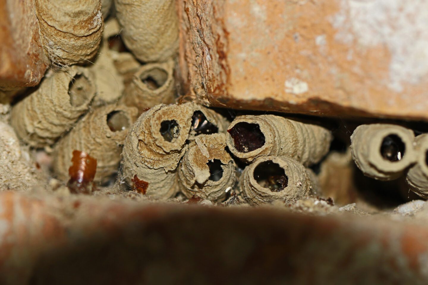 Mud dauber wasps construct nests by collecting small balls of moist soil using their mandibles and forelegs. Once transported to the nest site, each soil ball is pressed into place and then vibrated repeatedly by tapping motions of the wasp’s legs and mandibles. This vibratory compaction method packs soil particles more tightly, increasing the density and strength of the nest walls. Scientists have measured that the resulting nests are hard and very stiff, achieving dry densities comparable to soil samples compacted in laboratory “Proctor” tests—a standard method in civil engineering. The wasps preferentially collect well-graded soils rich in silt and small amounts of clay. Clay minerals act as natural cement, binding particles and increasing strength once the soil dries. Moreover, the nests maintain low moisture content, promoting capillary cohesion (a kind of natural “stickiness”) that further stabilizes the structure. Despite the small size and low weight of the wasps, the mechanical performance of their nests rivals that of engineered soil compaction processes, demonstrating remarkable natural ingenuity.