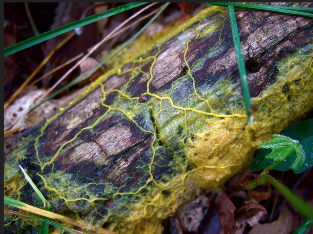Neither animal nor plant, the slime mold Physarum polycephalum is a large-scale single-celled organism that lives in damp forests. At a glance it may look like a splash of paint, but patient observation reveals it creeping across surfaces by oozing forward in fingerlike projections.