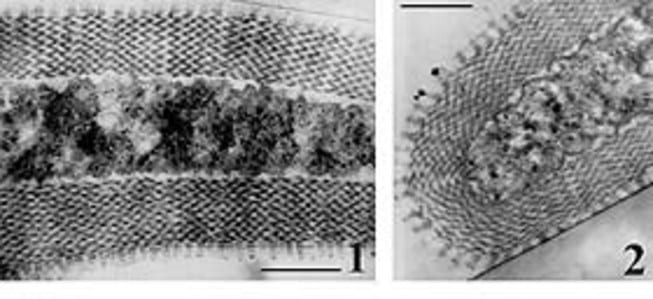 An aquaporin molecule contains six long stretches of helices that stick through a cell membrane like a peephole through a door. Together, they form a tiny tunnel about the size of a water molecule. The center of the aquaporin channel carries a positive charge, which repels other positively charged molecules and prevents them from passing through. Thus, only small, uncharged molecules such as water are able to pass through the channel. Increasing efficiency, aquaporin molecules tend to appear in groups of four arranged together, creating a fifth pore in the middle that also moves water across the membrane.