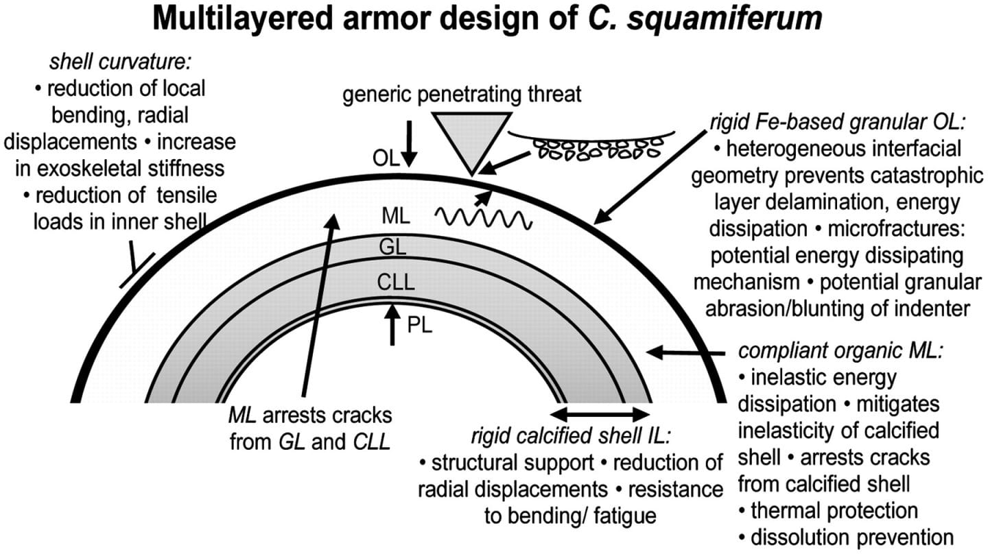 At the bottom of the Indian Ocean are large hydrothermal vents that spew hot water and minerals. They also provide an ecosystem for a variety of bizarre species adapted for living in harsh conditions. One such species is the golden scale snail (Chrysomallon squamiferum, sometimes called the scaly-foot) which feeds off of the vent’s nutrients. Adhered to the vent structures, the snail is vulnerable to predators such as crabs and venomous snails that can puncture or crush the scaly-foot snail. To protect itself, the snail uses a hard, armor-like shell with a tri-layered composition. Each layer has distinct chemical and physical properties that enable them to play different roles in managing forces from predatory attacks.