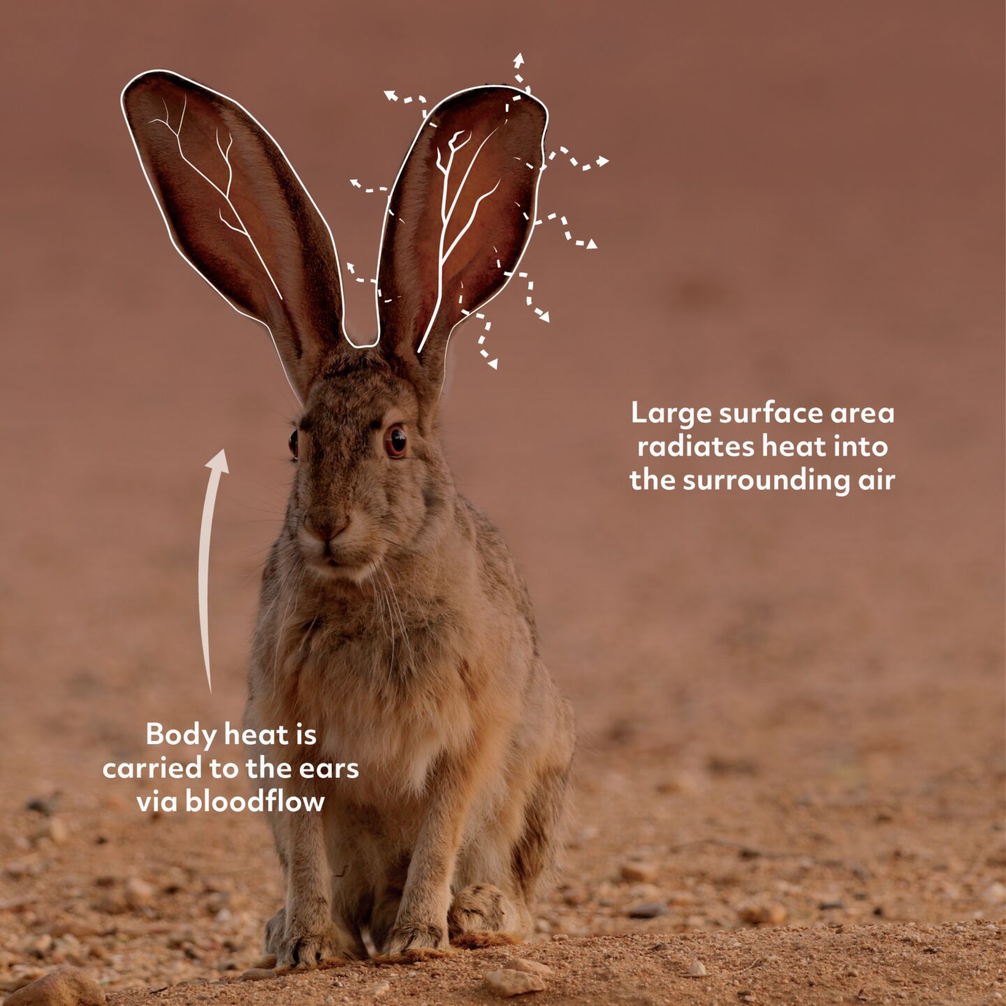 The jackrabbit’s large ears provide an expansive surface area of exposed skin loaded with blood vessels. When the surrounding air temperature is slightly below body temperature, as when it retreats from hot desert sun into shade, the blood vessels in the outer part of its ears widen in a process called vasodilation. This results in greater circulation of warm blood from the body’s core to the jackrabbit’s ears, where heat is lost to the cooler surrounding air.