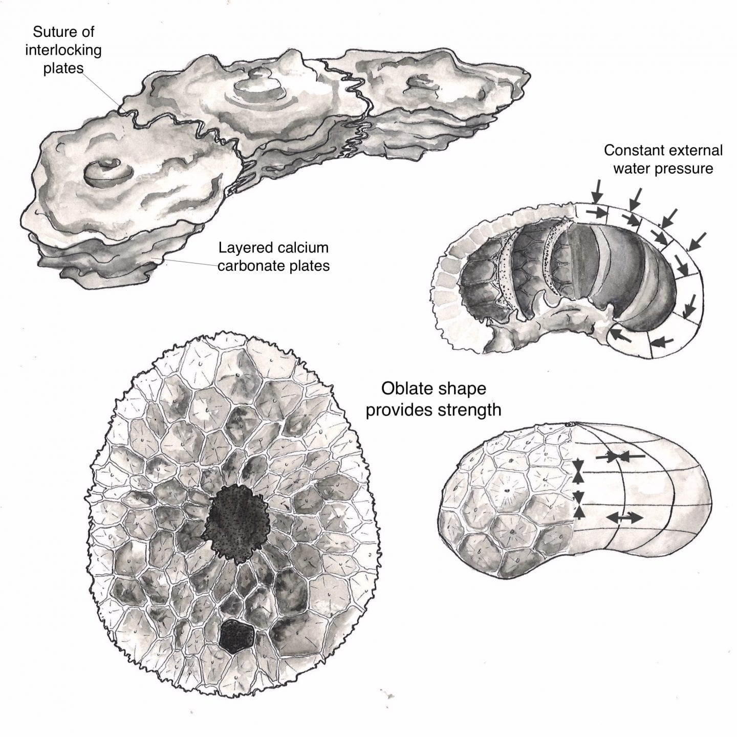 In addition to the material and the arrangement of the plates, the sea urchin shell is also strong because of its shape. The shell is oblate, meaning it resembles a flattened sphere. The shell naturally develops into this shape as it grows because of the constant intense pressure of the surrounding water. This shape helps relieve the impact of the water pressure on a single point by distributing the force over a larger area, similar to the interlocking plates.